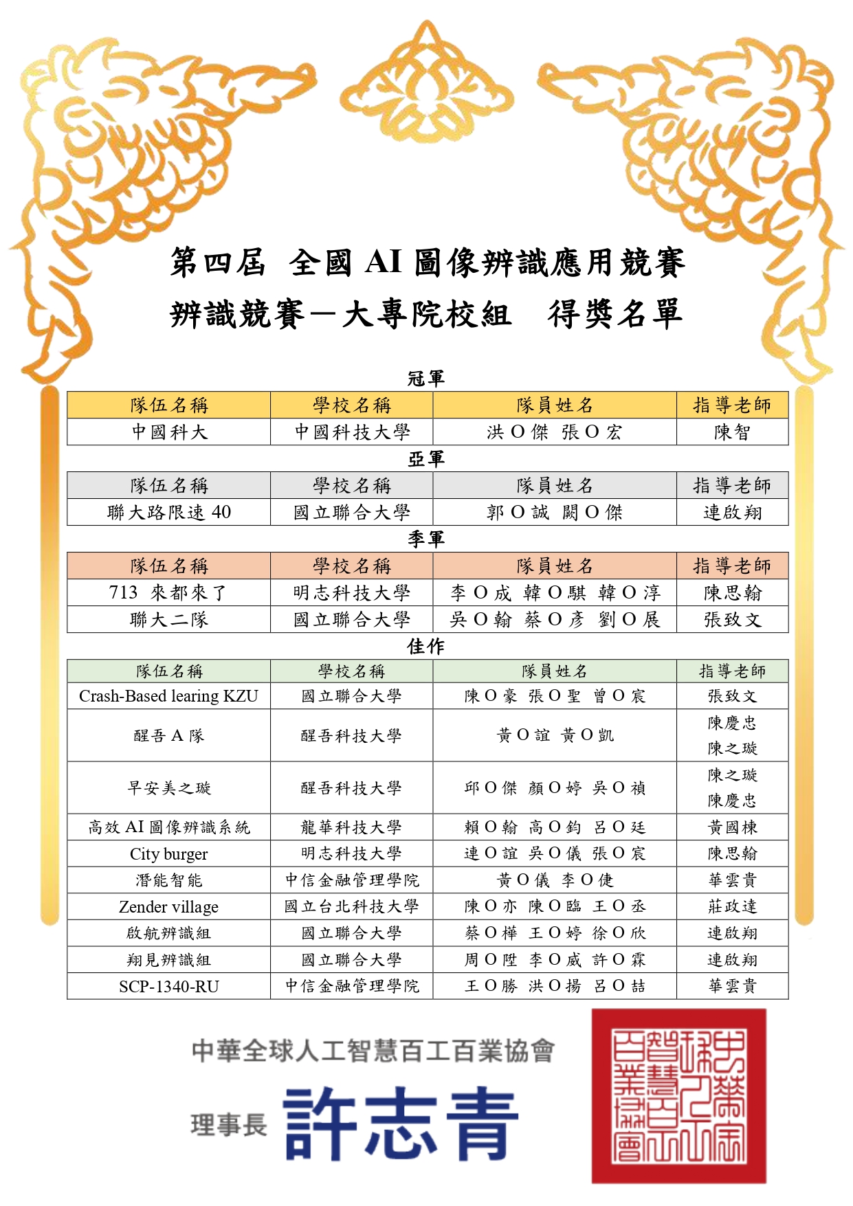 第四屆 全國AI圖像辨識應用競賽 大專院校組 決賽得獎名單